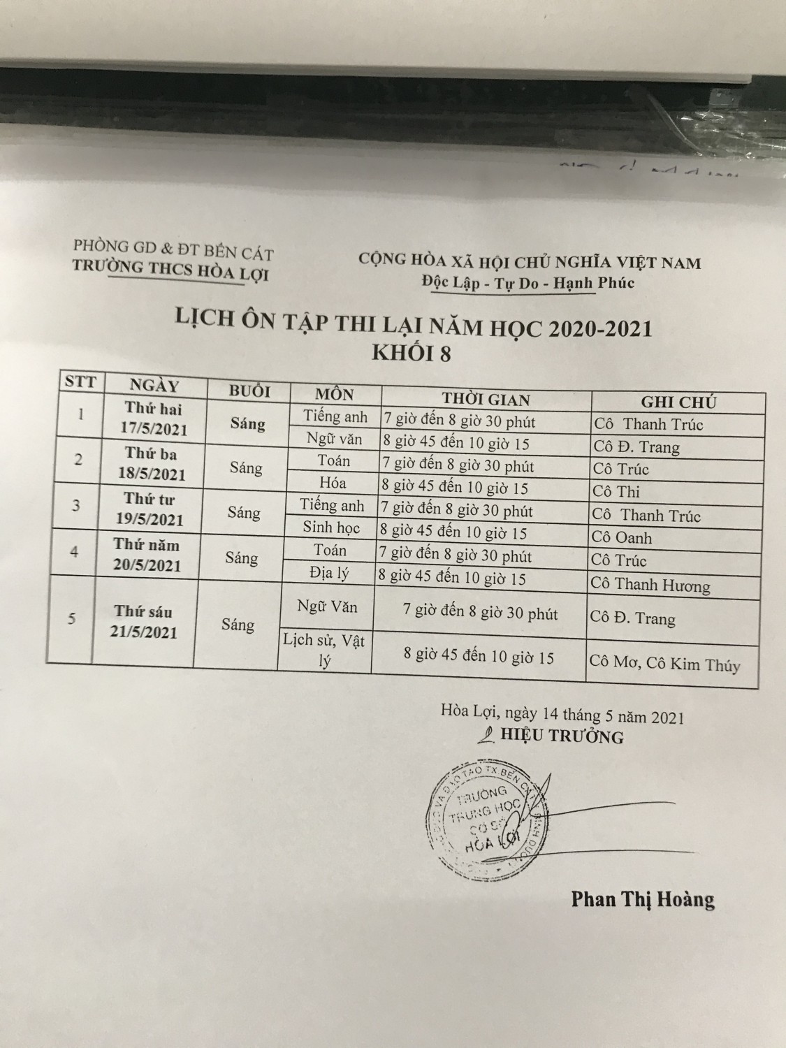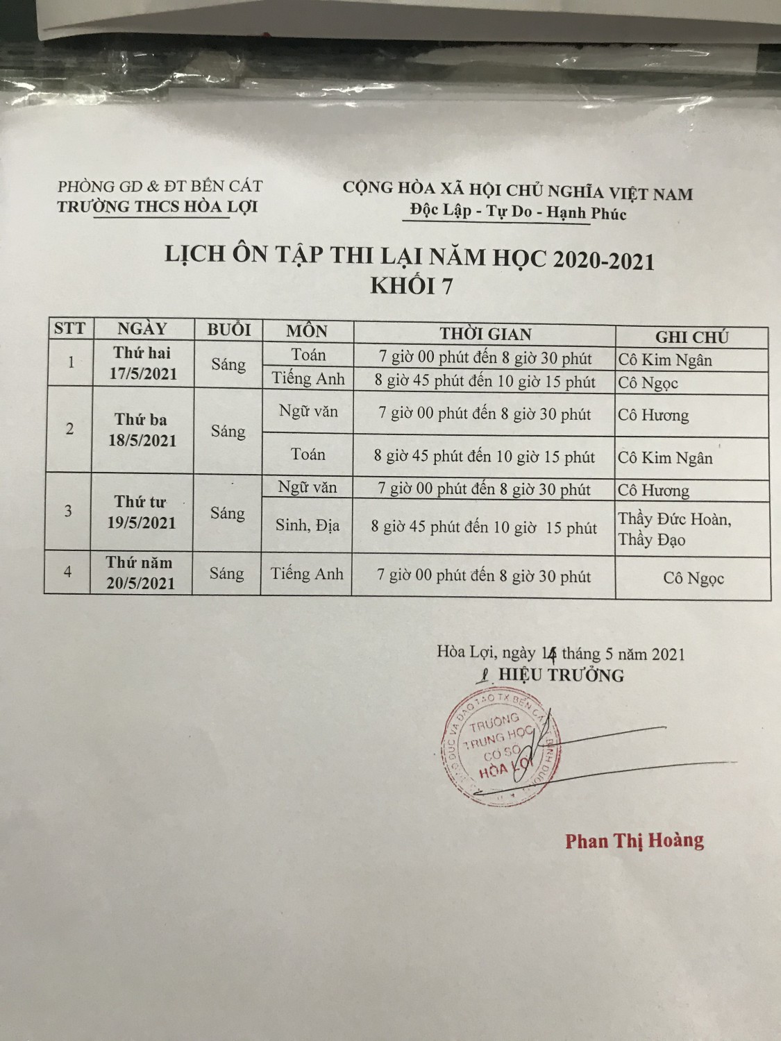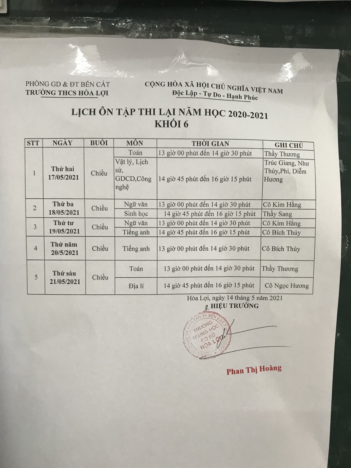 Trường THCS Hòa Lợi thông báo cho học sinh lớp 6,7,8  phải thi lại năm học 2020-2021. Thời gian ôn thi lại từ ngày 15/5/2021 đến 21/5/2021.